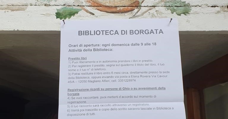 Aperta da 2019, la Biblioteca ha voluto offrire, ancor prima della costituzione dell’Associazione Borgata Ghio, un punto di possibile ritrovo per i borghigiani intorno ai documenti scritti, alle immagini fotografiche, alle memorie orali che testimoniano la vita di una Borgata grande e viva qual è stata la Borgata Ghio.