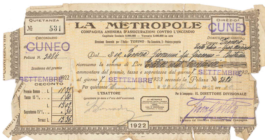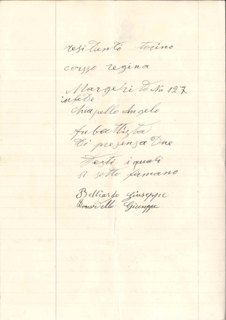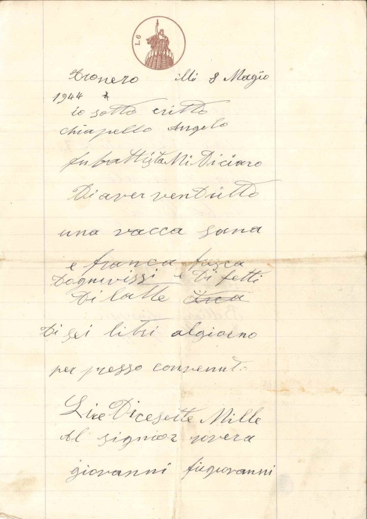 Io sotto scritto Chiapello Angelo fu Battista. Vi Diciaro di aver vendutto una vacca sana e franca fresca Dognivissi e Difetti Di latte circa Di sei litri algiorno per prezzo convenuto Lire Dicesette Mille al signor rovera giovanni fu giovanni residento torino Corsso regina Margherita n. 127