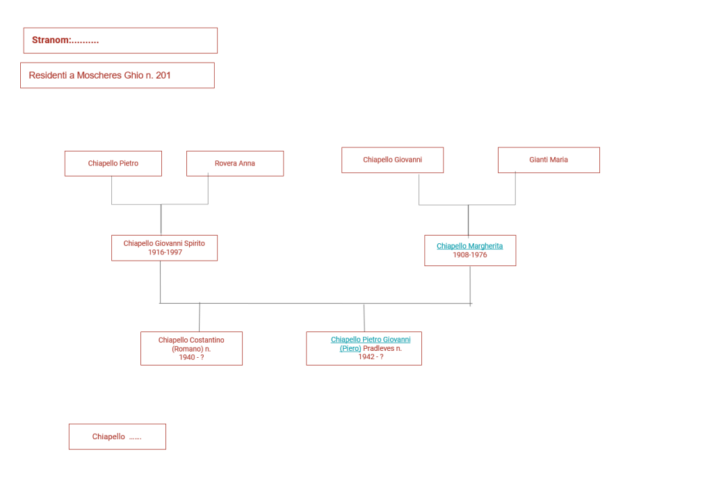 Persone di indole mite, abitavano la prima casa della Borgata. Chiapello Giovanni Spirito accudiva i propri terreni mentre la moglie Margherita allevava un po’ di galline che vendeva agli altri abitanti della borgata.