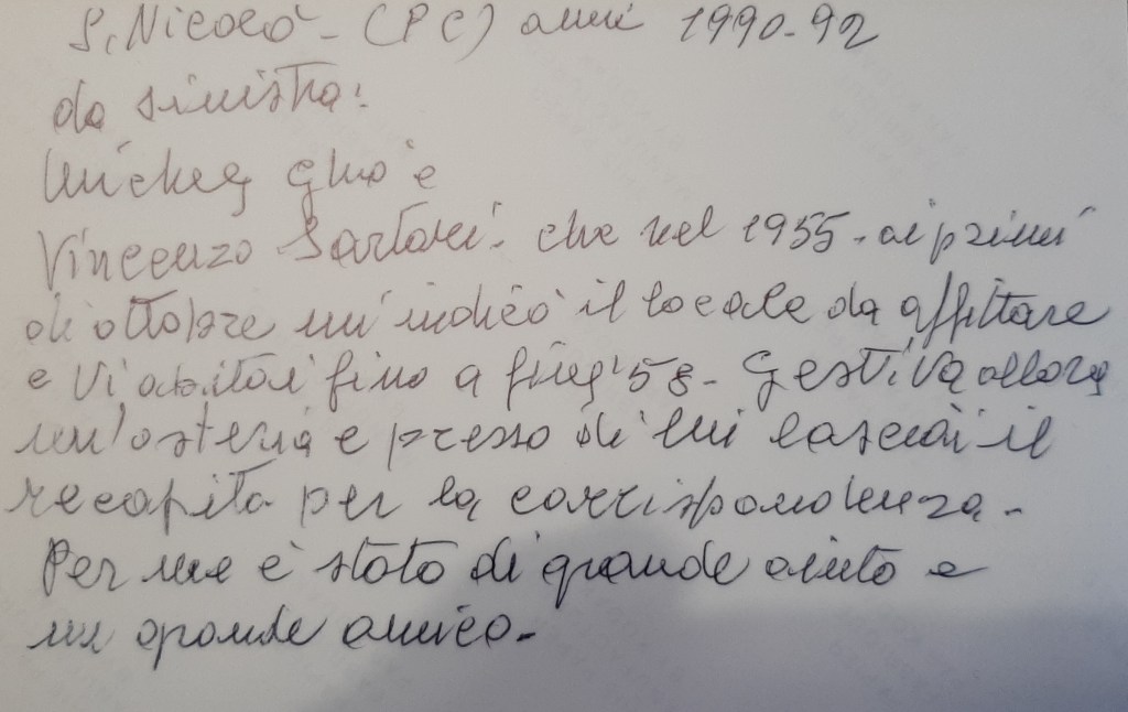 Ghio Michele e Pomero Margherita, mercato di BroniPomero Margherita, mercato di BroniGhio Michele a Broni con l’amico Vincenzo Sartoribiglietto di Ghio Michele: da sinistra Michele Ghio e Vincenzo Sartori che nel 1955 ai primi di ottobre mi indicò il locale da affittare e vi abitai fino a fine ’58. Gestiva allora un’osteria e presso di lui lasciai il recapito per al corrispondenza. Per me è stato un grande aiuto e un grande amico.