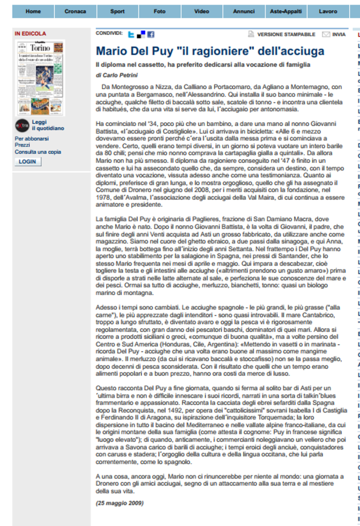 Da Montegrosso a Nizza, da Calliano a Portacomaro, da Agliano a Montemagno, con una puntata a Bergamasco, nell´Alessandrino. Qui installa il suo banco minimale – le acciughe, qualche filetto di baccalà sotto sale, scatole di tonno – e incontra una clientela di habitués, che da una vita si serve da lui, l´acciugaio per antonomasia. Ha cominciato nel ‘34, poco più che un bambino, a dare una mano al nonno Giovanni Battista, «l´acciugaio di Costigliole». Lui ci arrivava in bicicletta: «Alle 6 e mezzo dovevamo essere pronti perché c´era l´uscita dalla messa prima e si cominciava a vendere. Certo, quelli erano tempi diversi, in un giorno si poteva vuotare un intero barile da 80 chili; pensi che mio nonno comprava la cartapaglia gialla a quintali». Da allora Mario non ha più smesso. Il diploma da ragioniere conseguito nel ‘47 è finito in un cassetto e lui ha assecondato quello che, da sempre, considera un destino, con il tempo diventato una vocazione, vissuta adesso anche come una testimonianza. Quanto ai diplomi, preferisce di gran lunga, e lo mostra orgoglioso, quello che gli ha assegnato il Comune di Dronero nel giugno del 2008, per i meriti acquisiti con la fondazione, nel 1978, dell´Avalma, l´associazione degli acciugai della Val Maira, di cui continua a essere animatore e presidente. La famiglia Del Puy è originaria di Paglieres, frazione di San Damiano Macra, dove anche Mario è nato. Dopo il nonno Giovanni Battista, è la volta di Giovanni, il padre, che sul finire degli anni Venti acquista ad Asti un grosso fabbricato, da utilizzare anche come magazzino. Siamo nel cuore del ghetto ebraico, a due passi dalla sinagoga, e qui Anna, la moglie, terrà bottega fino all´inizio degli anni Settanta. Nel frattempo i Del Puy hanno aperto uno stabilimento per la salagione in Spagna, nei pressi di Santander, che lo stesso Mario frequenta nei mesi di aprile e maggio. Qui impara a descabezar, cioè togliere la testa e gli intestini alle acciughe («altrimenti prendono un gusto amaro») prima di disporle a strati nelle latte alternate al sale, e perfeziona le sue conoscenze del mare e dei pesci. Ormai sa tutto di acciughe, merluzzo, bianchetti, tonno: quasi un biologo marino di montagna. Adesso i tempi sono cambiati. Le acciughe spagnole – le più grandi, le più grasse (“alla carne”), le più apprezzate dagli intenditori – sono quasi introvabili. Il mare Cantabrico, troppo a lungo sfruttato, è diventato avaro e oggi la pesca vi è rigorosamente regolamentata, con gran danno dei pescatori baschi, dominatori di quei mari. Allora si ricorre a prodotti siciliani o greci, «comunque di buona qualità», ma a volte persino del Centro e Sud America (Honduras, Cile, Argentina): «Mettendo in vasetti o in marinata – ricorda Del Puy – acciughe che una volta erano buone al massimo come mangime animale». Il merluzzo (da cui si ricavano baccalà e stoccafisso) non se la passa meglio, dopo decenni di pesca sconsiderata. Con il risultato che quelli che un tempo erano alimenti popolari e a buon prezzo, hanno ora costi da merce di lusso. Questo racconta Del Puy a fine giornata, quando si ferma al solito bar di Asti per un´ultima birra e non è difficile innescare i suoi ricordi, narrati in una sorta di talkin´blues frammentario e appassionato. Racconta la cacciata degli ebrei sefarditi dalla Spagna dopo la Reconquista, nel 1492, per opera dei “cattolicissimi” sovrani Isabella I di Castiglia e Ferdinando II di Aragona, su ispirazione dell´inquisitore Torquemada; la loro dispersione in tutto il bacino del Mediterraneo e nelle vallate alpine franco-italiane, da cui le origini montane della sua famiglia (come attesta il cognome: Puy in francese significa “luogo elevato”); di quando, anticamente, i commercianti noleggiavano un veliero che poi arrivava a Savona carico di barili di acciughe; i tempi eroici degli anciuè, conquistadores con caruss e stadera; l´orgoglio della cultura e della lingua occitana, che lui parla correntemente, come lo spagnolo. A una cosa, ancora oggi, Mario non ci rinuncerebbe per niente al mondo: una giornata a Dronero con gli amici acciugai, segno di un attaccamento alla sua terra e al mestiere della sua vita.