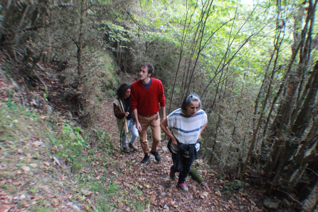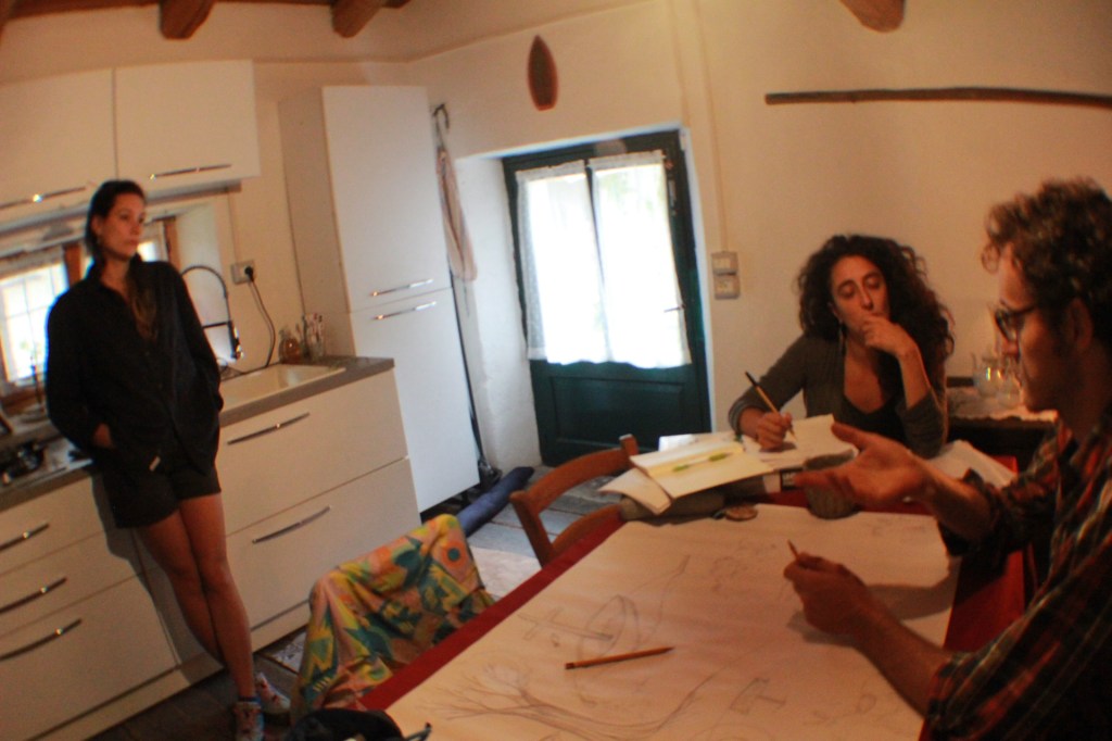 In questi giorni abbiamo anche fatto esperienza dello spazio peculiare vissuto nella borgata: la posizione particolare, di altura stretta tra alte montagne, ci ha dato inizialmente una sensazione di chiusura, esaltata dalla mancanza di orizzonte, dalla fitta vegetazione e dalla scarsità di interazione con altri paesani. Ci siamo però resi conto di come questa percezione si sia modificata radicalmente dopo aver fatto una passeggiata verso la borgata di Santa Margherita, a circa venti minuti di cammino, dove i bambini di Ghio andavano a scuola: lungo il percorso abbiamo incontrato due cappelle votive,“piloni”con splendidi affreschi, e la roccia dove la madrina di Elena diceva di incontrare la vipera con cui, secondo il racconto, aveva ripetutamente dialogato. La nostra mappa mentale e fisica si è ampliata e questo ha modificato in parte la sensazione di isolamento e la stessa collocazione di Codighu si è strutturata rispetto ad altri collegamenti e punti nello spazio. Il paesaggio, fatto di abitazioni, sentieri, alberi, dopo averlo vissuto si “apre”, il confine si sfuma, smette di essere limite per diventare permeabile, denso di significato e di affetto, diventa risorsa e contenimento, identità (anche se momentanea).
