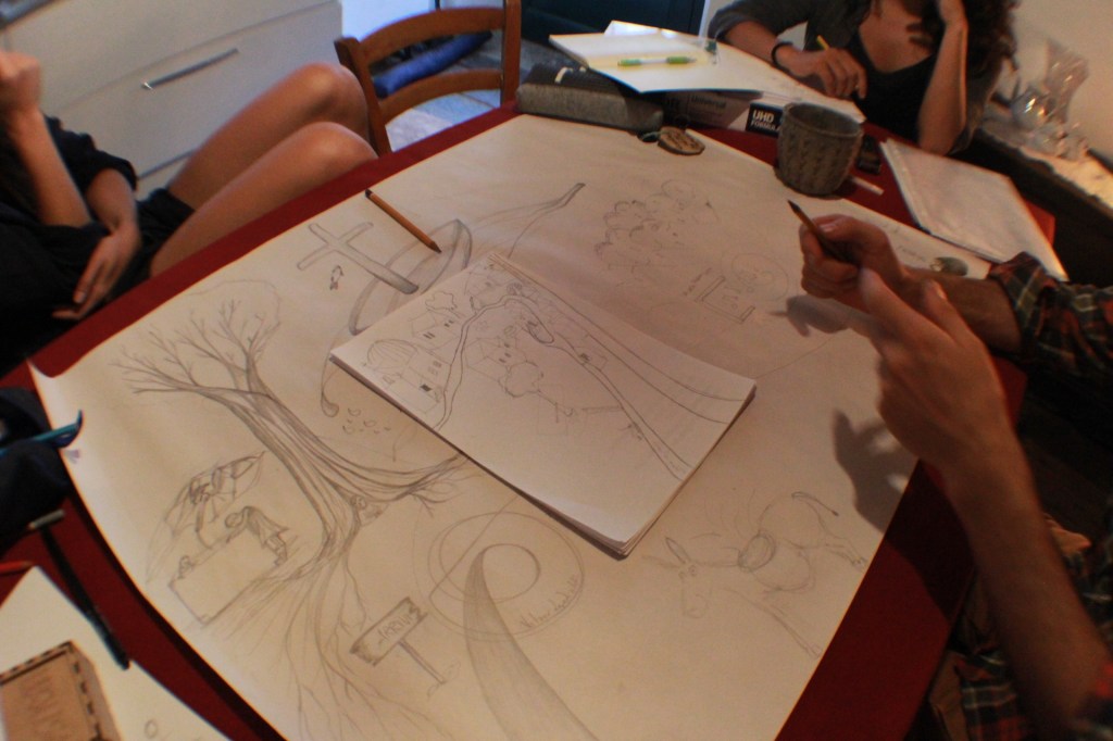 Successivamente abbiamo iniziato a disegnare collettivamente delle mappe della borgata e delle mappe immaginarie, ovvero disegnate seguendo una geografia soggettiva dei luoghi che rappresentasse oltre che la forma fisica della borgata, le emozioni suscitate dai racconti (reali o fantastici) e li rappresentasse in forma grafica. Vivendo lo spazio e il tempo insieme ci siamo resi conto come fin da subito il nostro immaginario abbia iniziato a modificarsi e a influenzarsi reciprocamente.